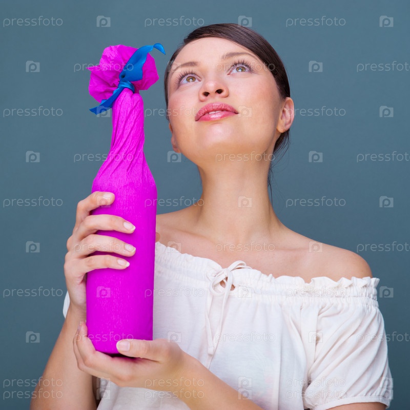 Портрет молодой красивой женщины, держащей бутылку вина в подарочной упаковке