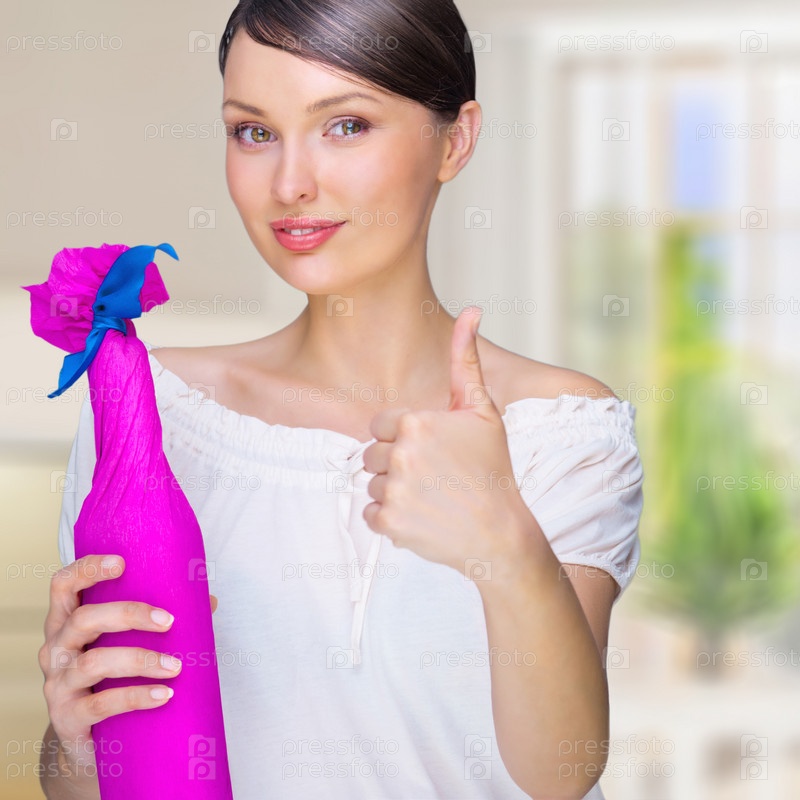 Портрет молодой красивой женщины, держащей бутылку вина в подарочной упаковке