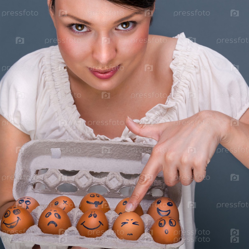 Женщина держит яйца с различными эмоциями