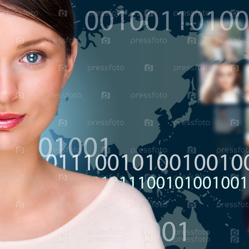 Молодая красивая женщина на фоне карты мира. Концепция социальной сети