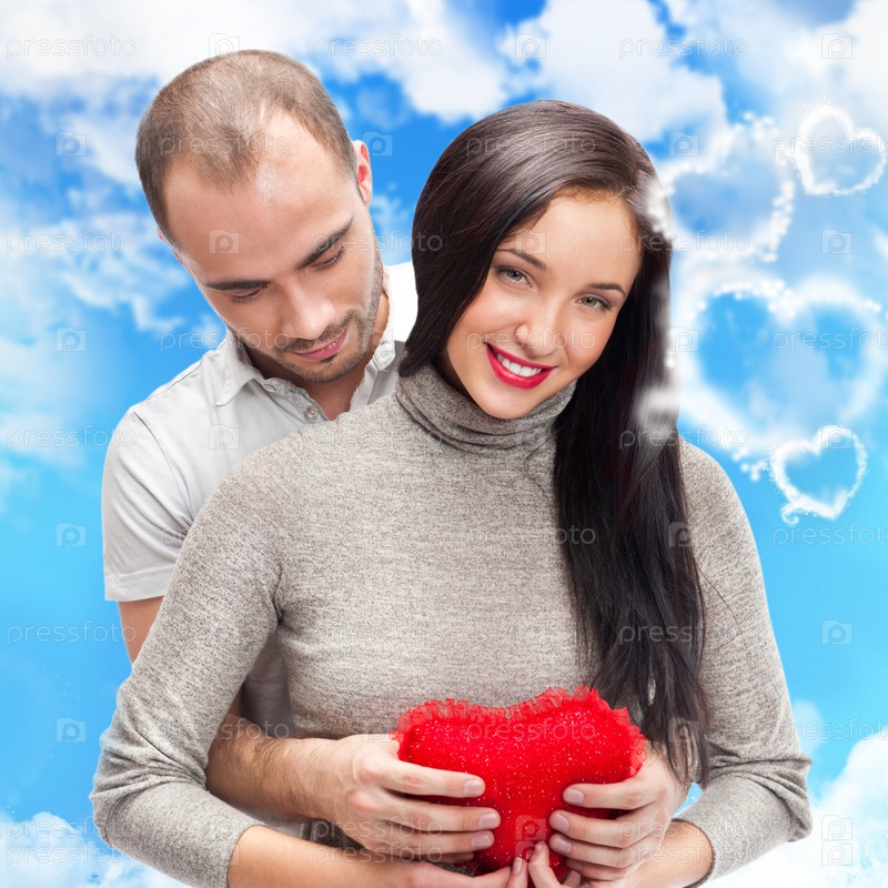 Счастливая молодая пара с красным сердцем на фоне неба с облаками