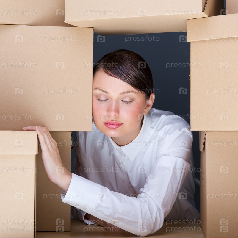 Портрет молодой женщины, окруженной кучей коробок