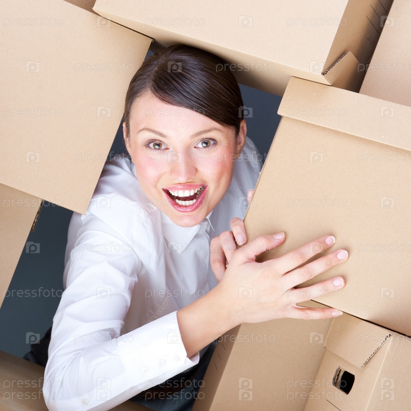 Портрет молодой женщины, окруженной кучей коробок