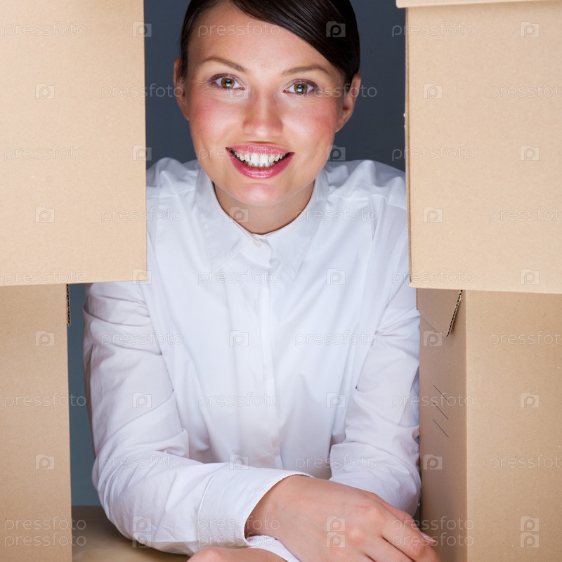 Портрет молодой женщины, окруженной кучей коробок