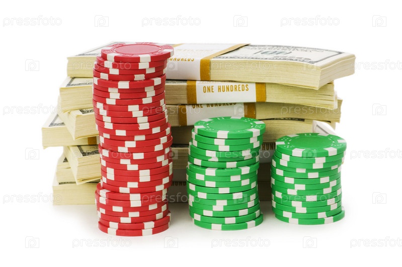 Стопки фишек казино и пачки долларов на белом фоне