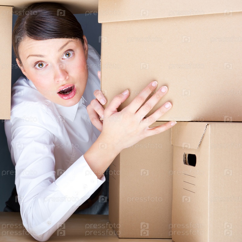 Портрет молодой женщины, окруженной кучей коробок