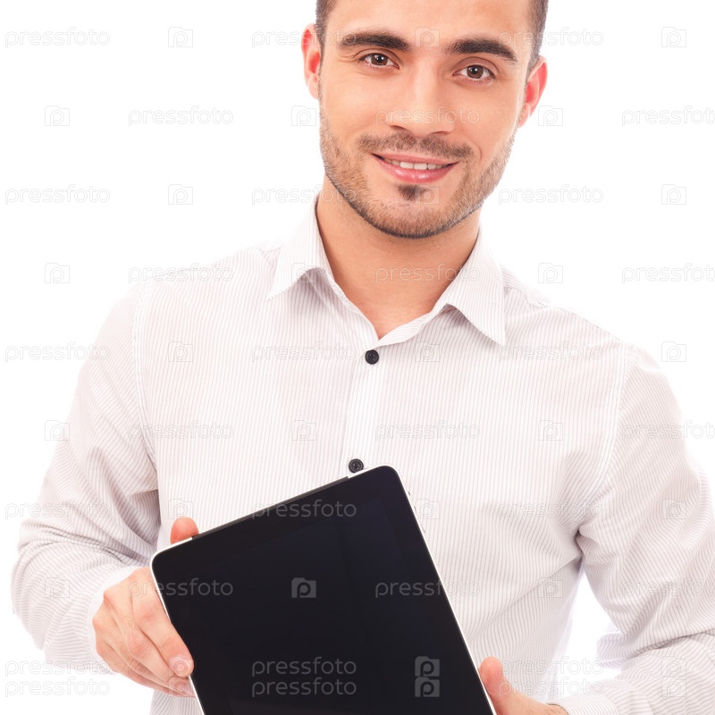 Мужчина показывает планшетный компьютер