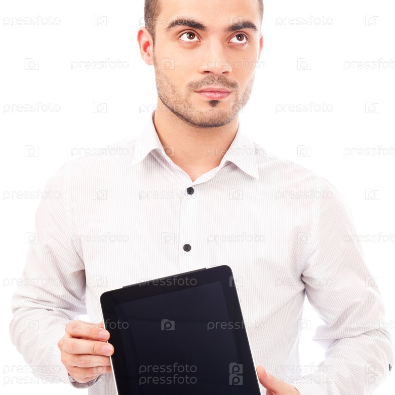 Мужчина показывает планшетный компьютер