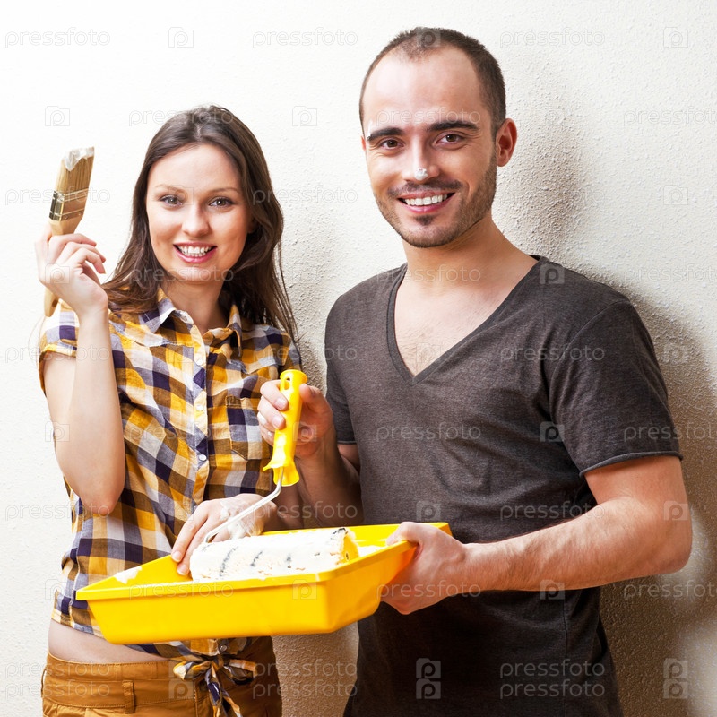 Счастливая пара красит стену