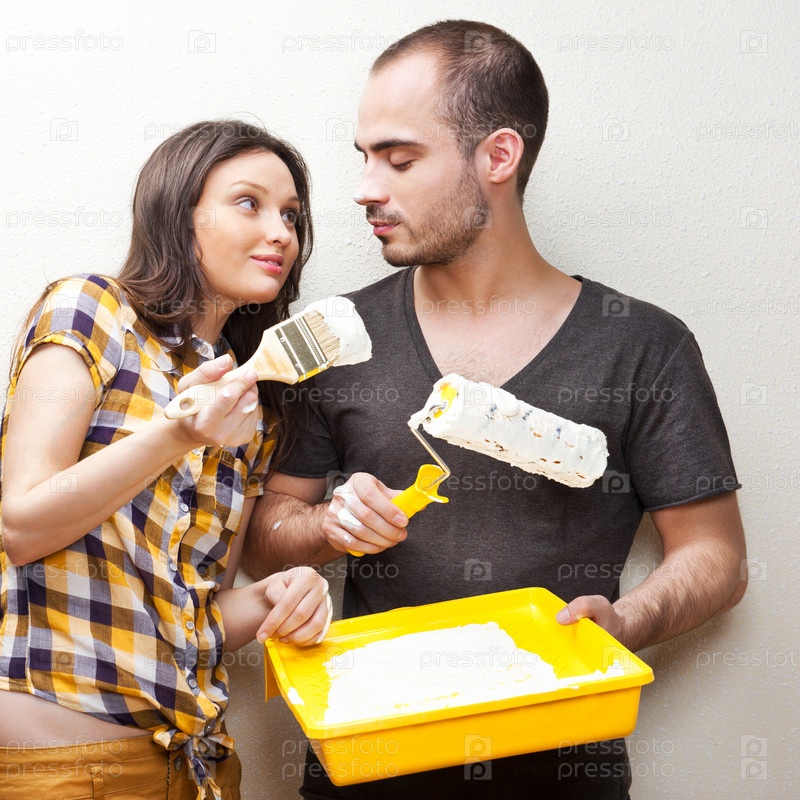 Счастливая пара красит стену