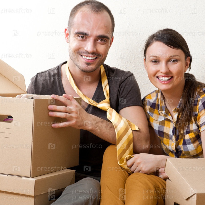 Молодая пара сидит на полу с коробкой и планирует будущее в новой квартире
