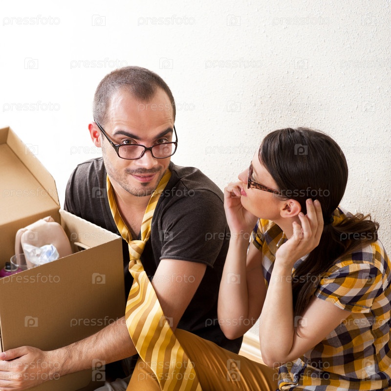 Молодая пара сидит на полу с коробкой и планирует будущее в новой квартире