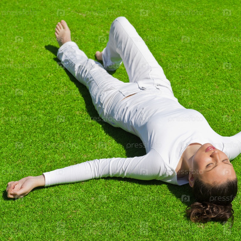 Красивая женщина на траве в белой одежде