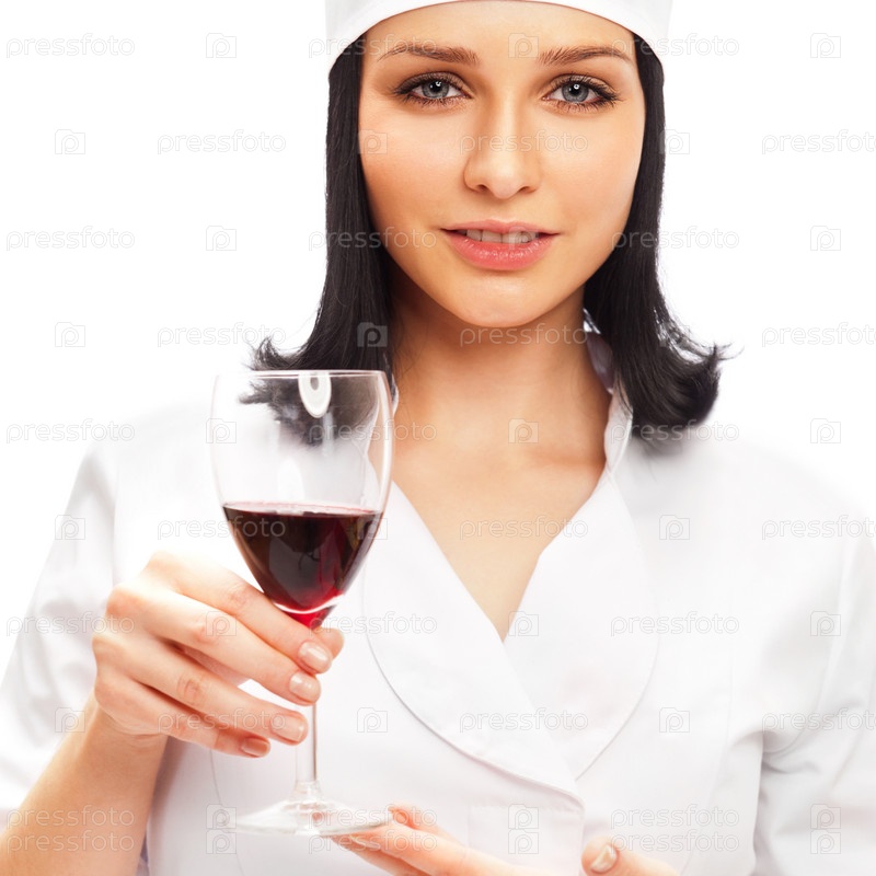 Шеф-повар представляет красное вино, изолировано на белом фоне