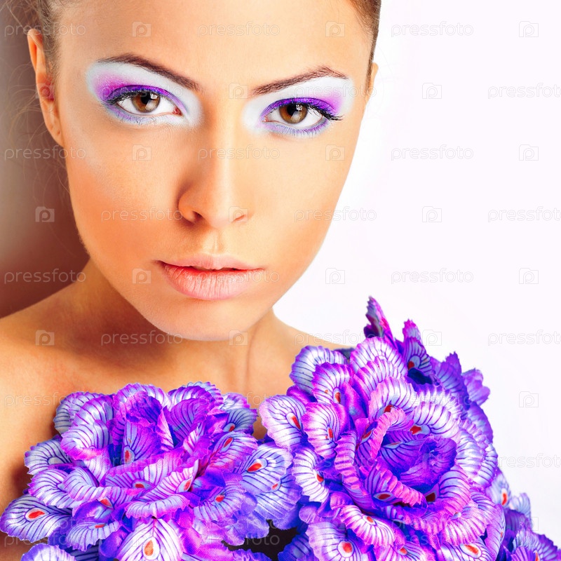 Великолепная женщина в голубом цветочным платье на белом фоне