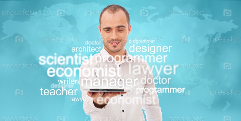 Взрослый мужчина ищет сотрудников или работу онлайн с помощью планшетного компьютера