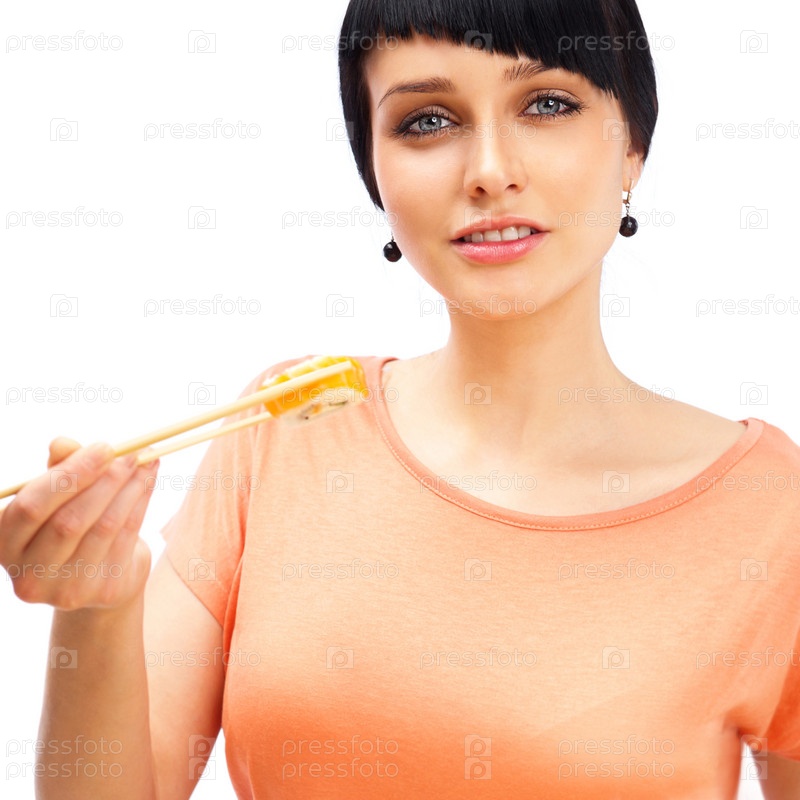 Молодая счастливая женщина ест суши роллы палочками, изолированная на белом фоне