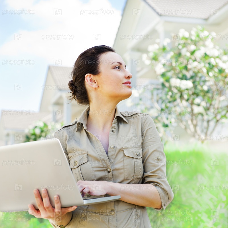 Агент по продаже недвижимости с ноутбуком представляет красивый особняк