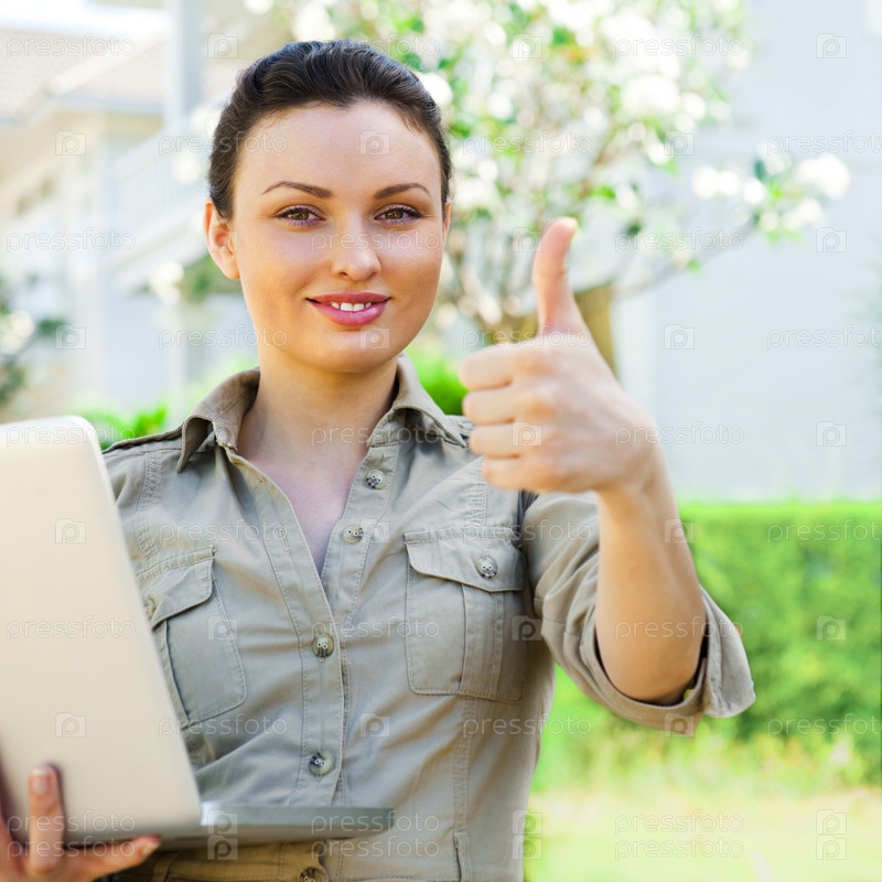 Агент по продаже недвижимости с ноутбуком представляет красивый особняк