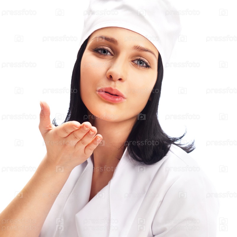 Профессиональный повар отправляет воздушный поцелуй, изолированный на белом фоне