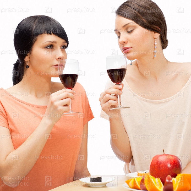 Веселые женщины едят фрукты и пьют красное вино