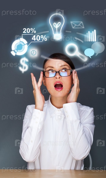 Деловая женщина думает о своей работе, задачах и планах. Различные иконки летают вокруг ее головы