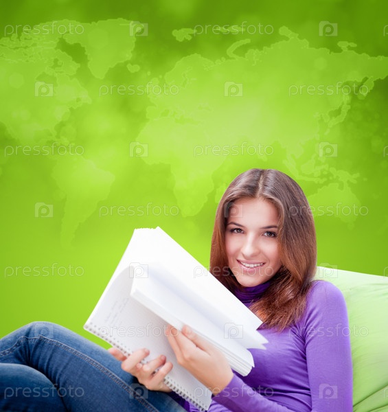 Женщина пишет в блокноте, сидя на фоне карты мира