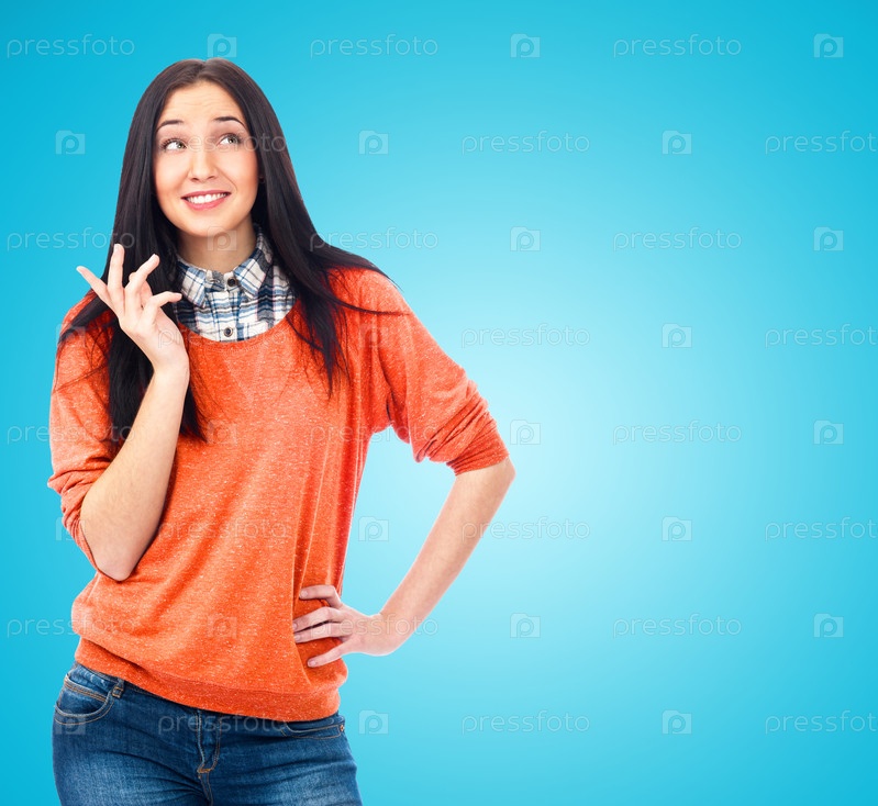 Красивая молодая женщина мечтает на синем фоне
