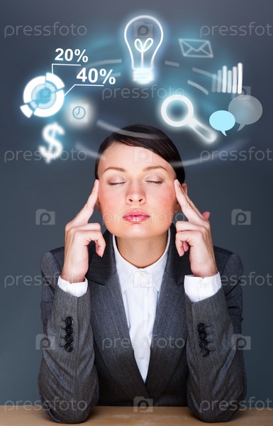 Бизнес-леди думает о работе, задачах и планах. Иконки различных действий летают вокруг ее головы