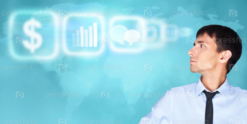 Человек, работающий с виртуальным интерфейсом на синем цифровом фоне