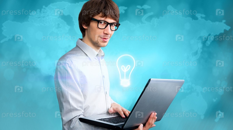 Деловой человек работает на современном компьютере с виртуальным интерфейсом. Слияние технологий