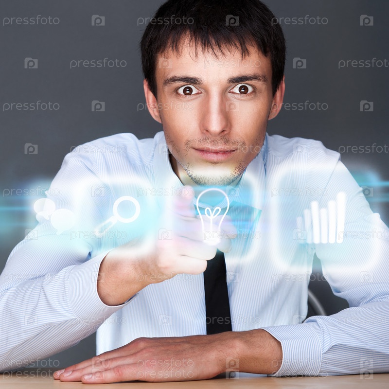 Деловой человек работает на современном компьютере с виртуальным интерфейсом. Слияние технологий