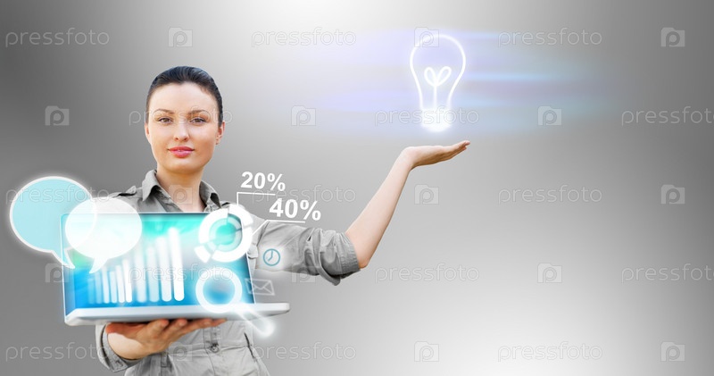 Деловая женщина представляет технологические решения на ноутбуке с виртуальными значками