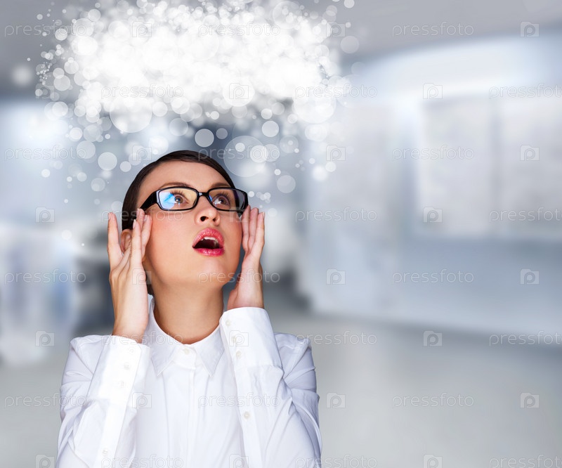 Бизнес-леди думает о чем-то на сером фоне с местом для текста над головой