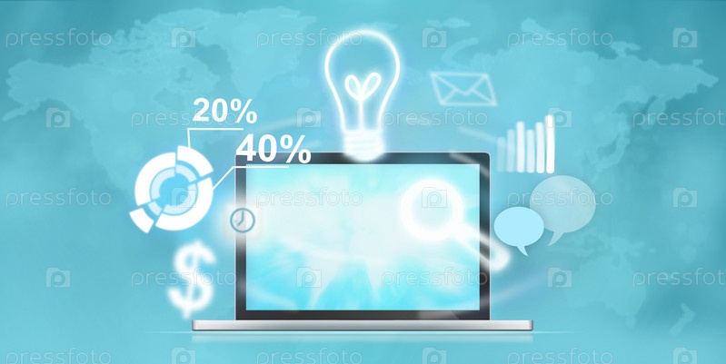 Открытый ноутбук с летающими иконками различных функций