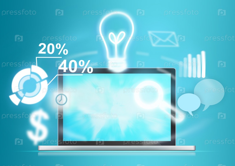 Открытый ноутбук с летающими иконками различных функций