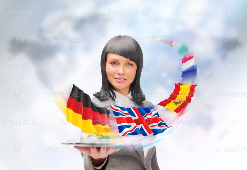 Молодая женщина держит планшетный компьютер. Флаги европейских стран летят из экрана. Международный бизнес или учеба за границей
