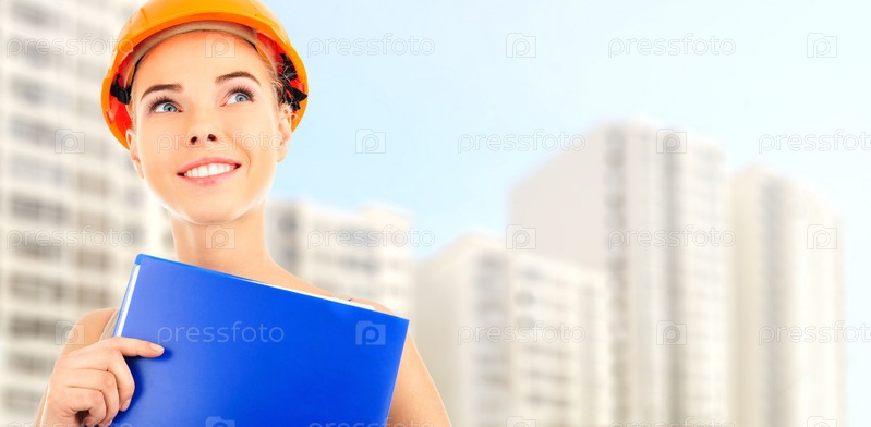 Симпатичная женщина представляет новую квартиру в строящемся современном доме