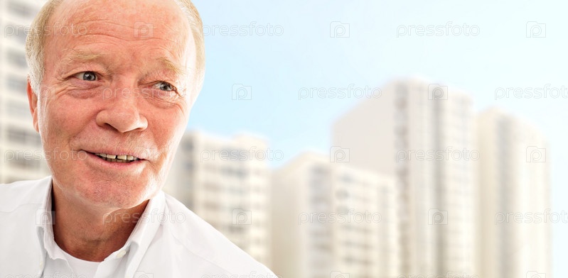 Старый мужчина счастлив с его новой квартирой в современном здании. Жилье для пожилых