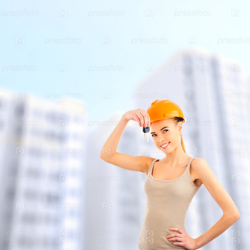 Симпатичная женщина представляет новую квартиру в строящемся современном доме