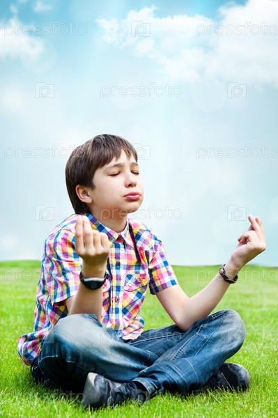 Очаровательный мудрый мальчик сидит на траве на заднем дворе