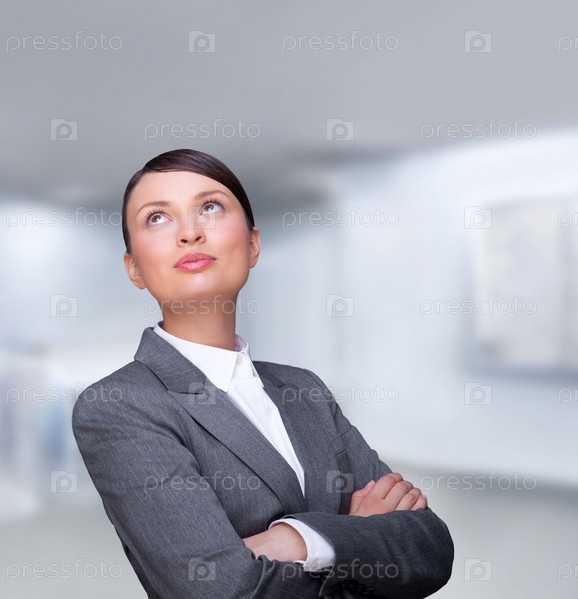 Уверенная деловая женщина стоит со сложенными руками в офисе