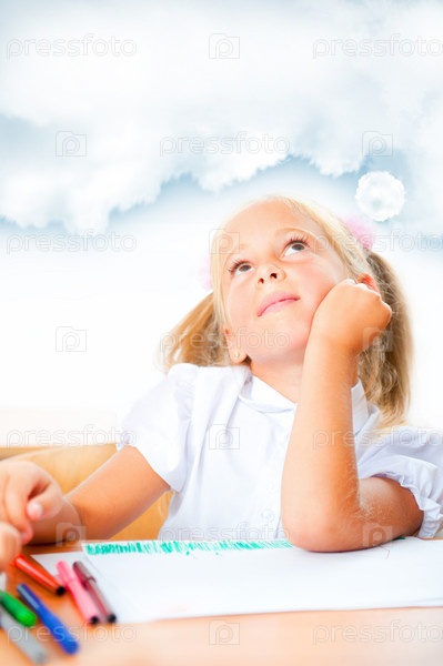Портрет мечтательной девочки за школьным столом с пространством для текста над головой