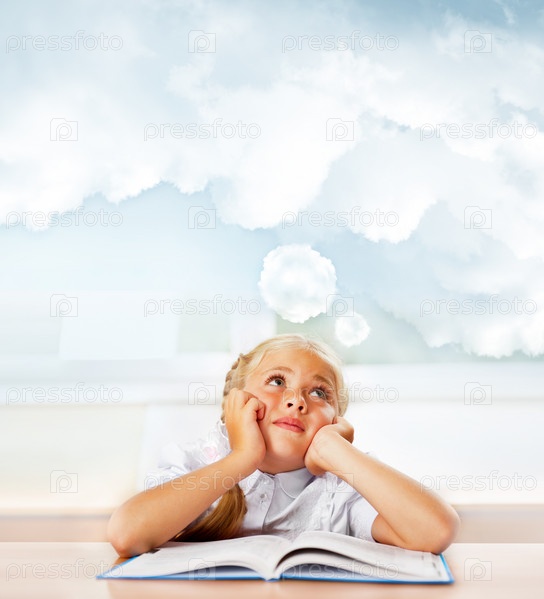 Портрет мечтательной девочки за школьным столом с пространством для текста над головой