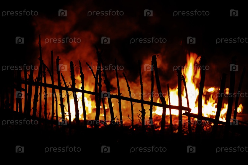 Пожар в сельской местности с деревянным забором на переднем плане