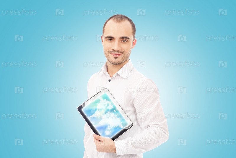 Улыбающийся мужчина показывает планшетный компьютер на синем цифровом фоне