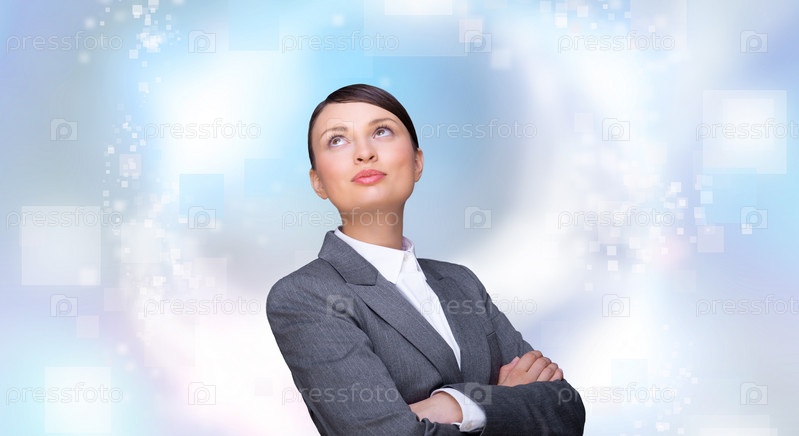 Деловая женщина стоит, сложа руки, на цифровом фоне