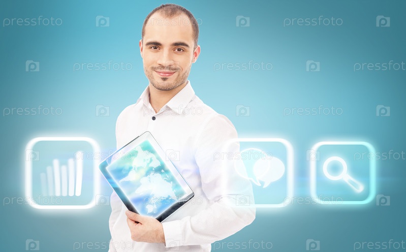 Деловой человек работает на современном компьютере с виртуальным интерфейсом. Слияние технологий