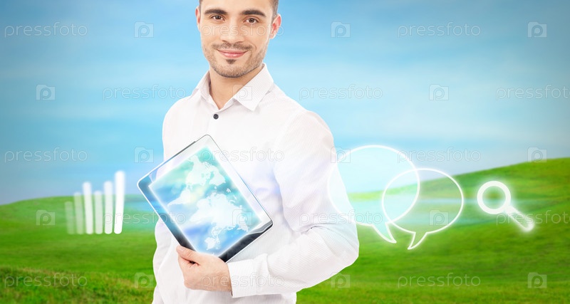 Деловой человек работает на современном компьютере с виртуальным интерфейсом. Слияние технологий