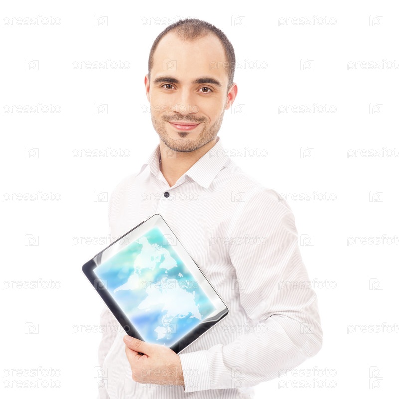 Улыбающийся мужчина показывает планшетный компьютер на белом фоне
